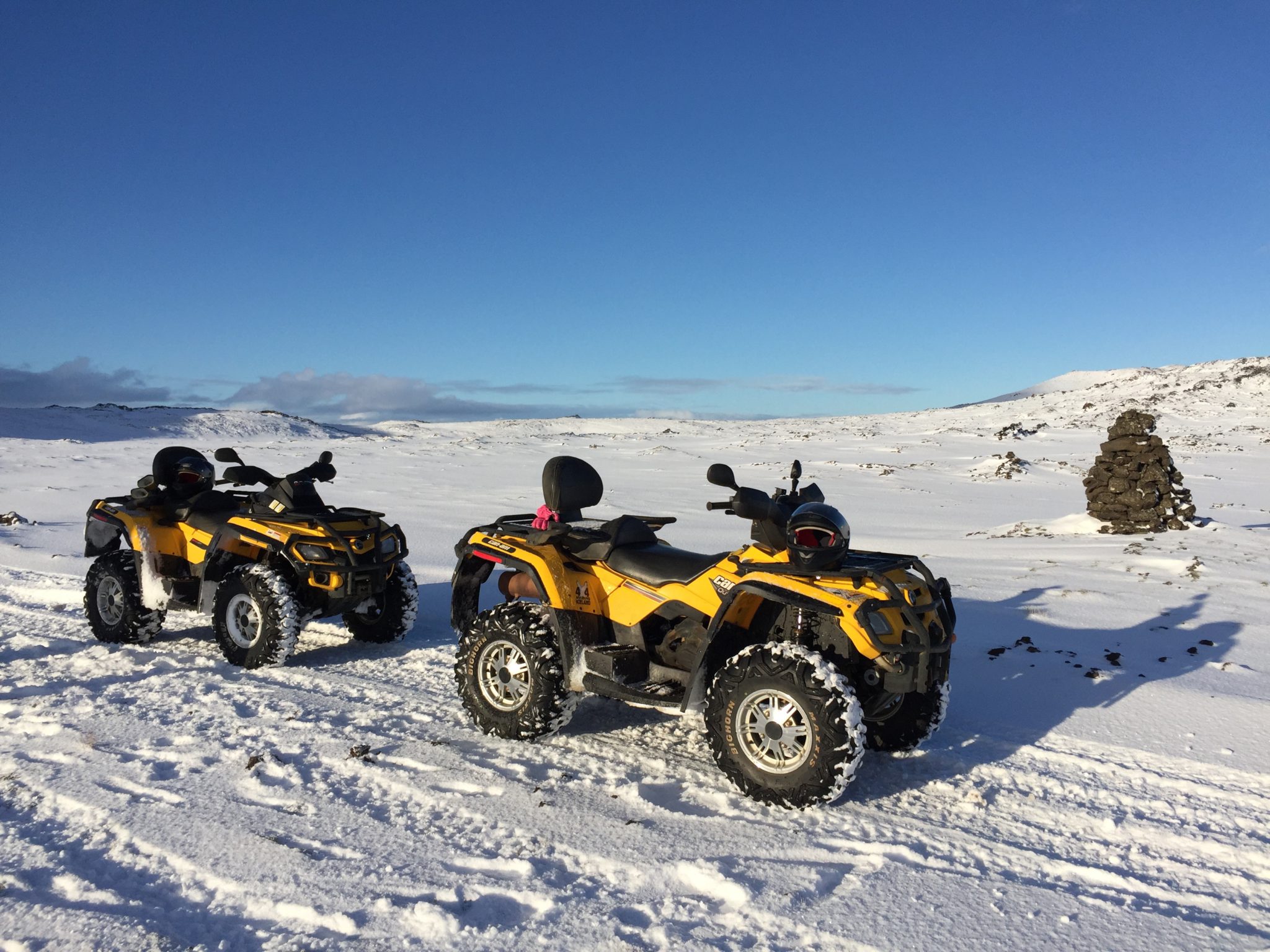 Puis, nous allons vers notre tour en Quad. Une heure de balade au milieu de la neige et des paysages chaotiques de l’Islande. Personnellement j’ai un peu luté contre mon quad pour le diriger de temps en temps (c’est que c’est lourd ces machins! Et ça glisse!), mais l’expérience est unique. Nous avons tous les trois été enchantés, d’autant que nous n’avons pas eu froid grâce à l’équipement prêté par la société.
